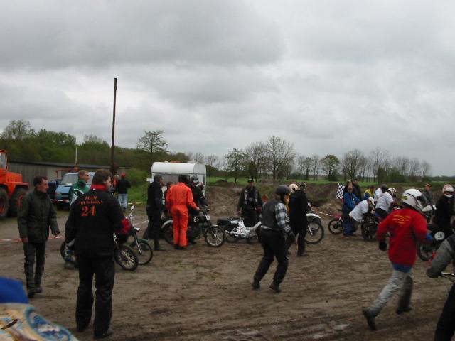 Passt doch..... Das Wetter wurde und wurde nicht bessser. Nach einem heissen Le Mans start Quälten alle ihre Mofas durch die schlammige Landschaft. Es gab viele Ausfälle zu verzeichnen. So auch unsere rote Puch...Zwei Runden hat sie gehalten. Unsere Bemühungen sie wieder ins Laufen zu bekommen waren vergebens. Die Grüne hielt eigentlich relativ gut durch, nur Kleinigkeiten waren Schuld das wir insgesamt eine Standzeit von ca. 1 Stunde hatten. Das wurde natürlich dann auch promt mit dem 18. Platz belohnt. Alles in allem war es wieder eine Geile veranstaltung.